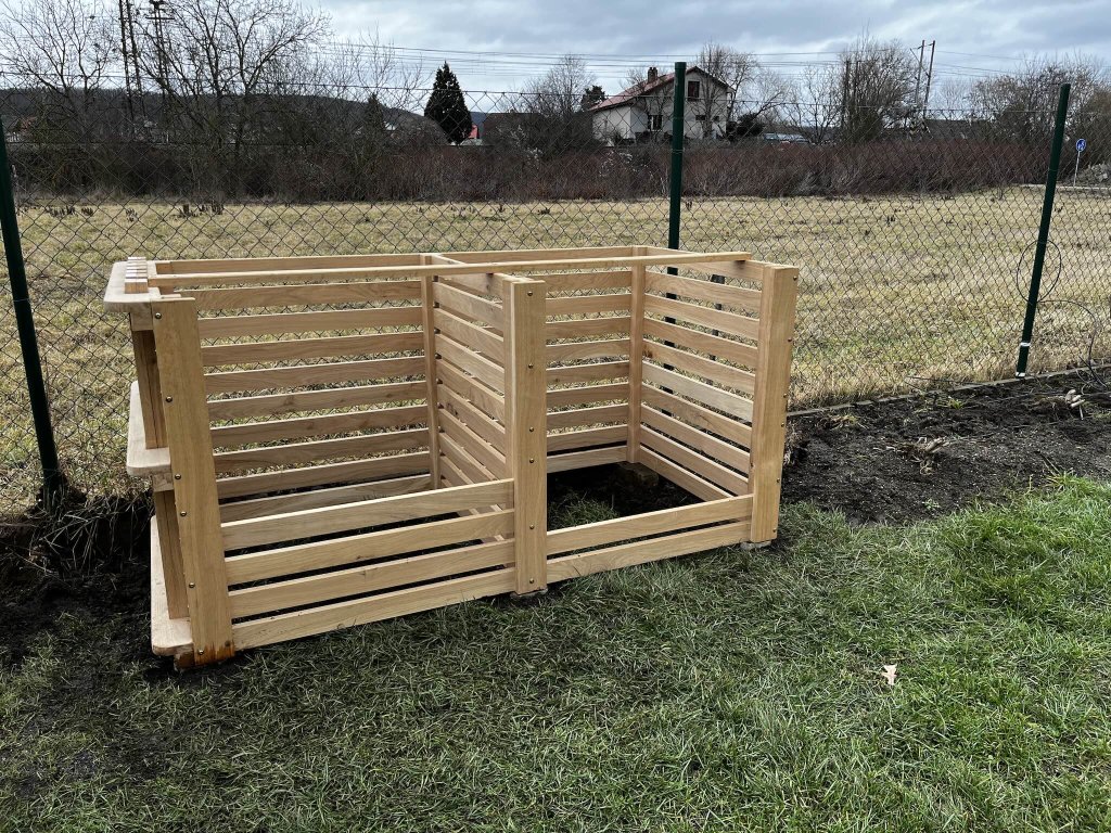 Dvoukomorový kompostér o objemu cca 2000 l je ideální pro většinu rodinných zahrad. Když máte totiž dvě komory, můžete kompost jednoduše přehazovat, což je pro rychlou přeměnu na kompost důležité. Náš kompostér vyrábíme z českého dubového dřeva, které odolává vlhkosti jednoznačně nejlíp. Samozřejmostí je snadný přístup z přední strany. Prkna je možné po jednom ze shora odebírat a ukládat chytře do držáku.